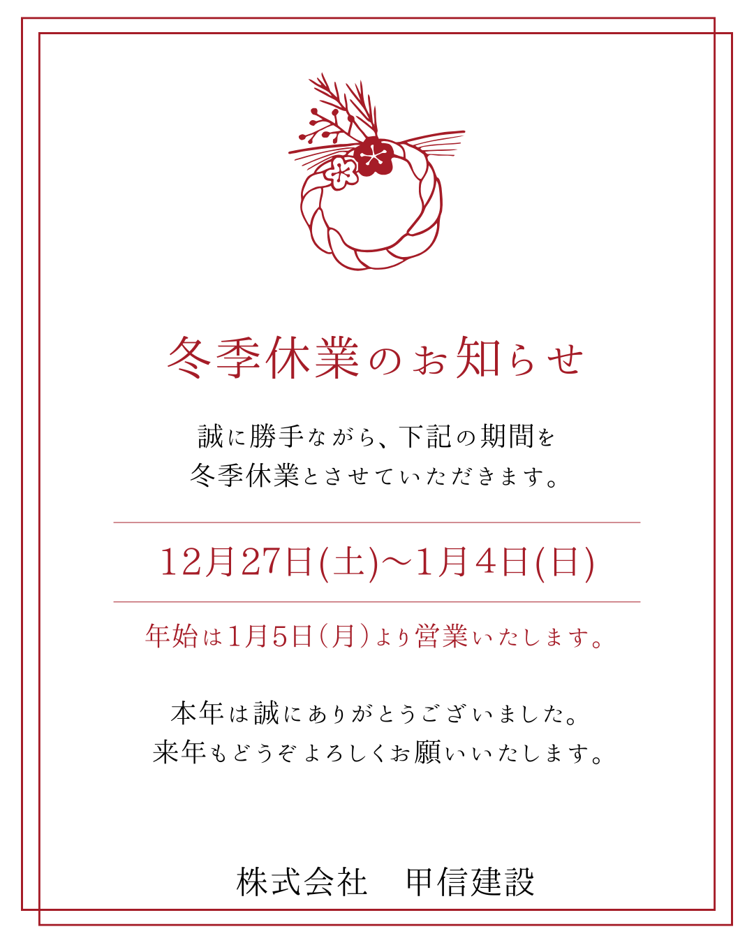 平素より株式会社甲信建設をご愛顧いただき、誠にありがとうございます。誠に勝手ながら、下記の期間を冬季休業とさせていただきます。